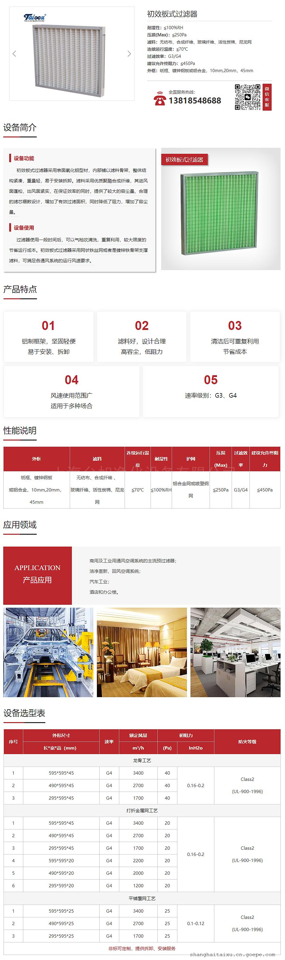板式初效空气滤网 空调前置预过滤 大型空压机预过滤器